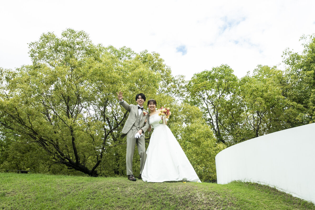 挙式のお時間が結び、挙式会場前でゲストの皆様と全員集合写真をお撮りしたあと、まるでおふたりの新居に皆さまを招くかのように、おふたりに先導をしていただきます。
