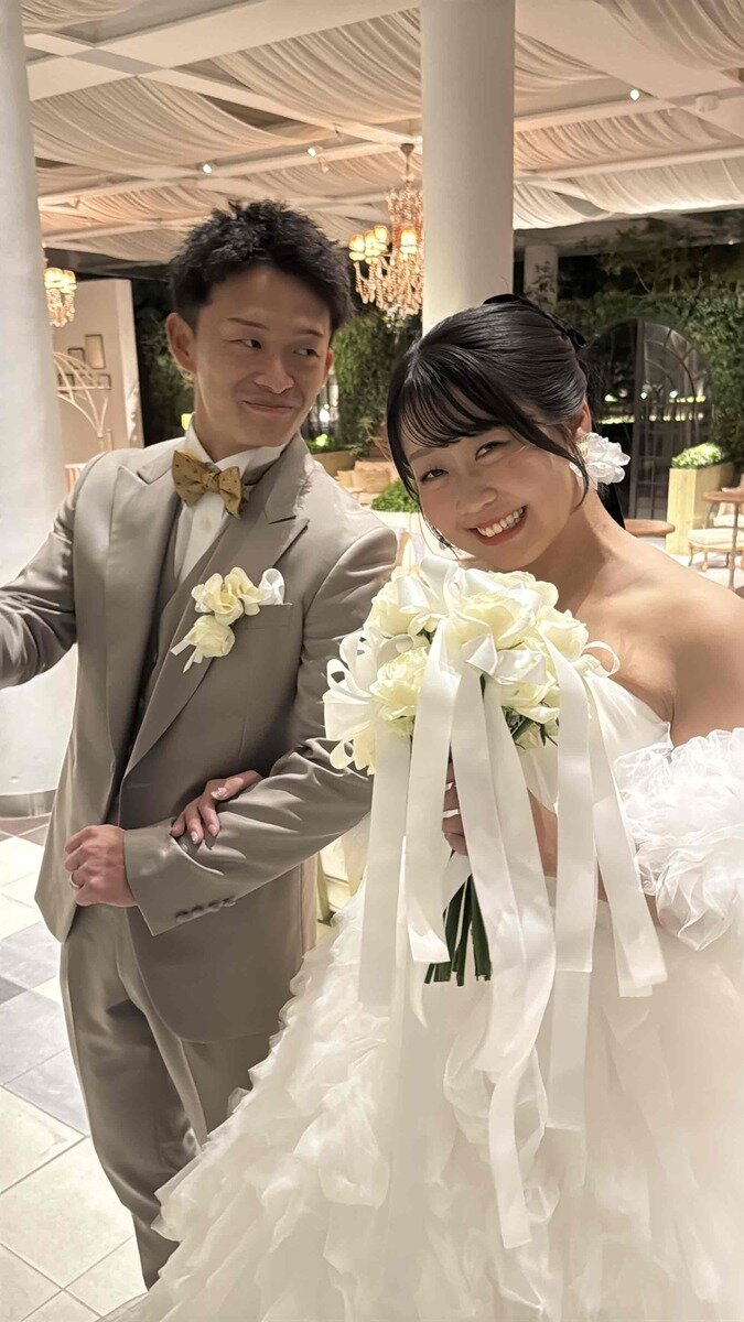 ふわふわのアウラノーヴァのウェディングドレスにシンプルな白いバラに長めのリボンが特徴的なブーケ。
