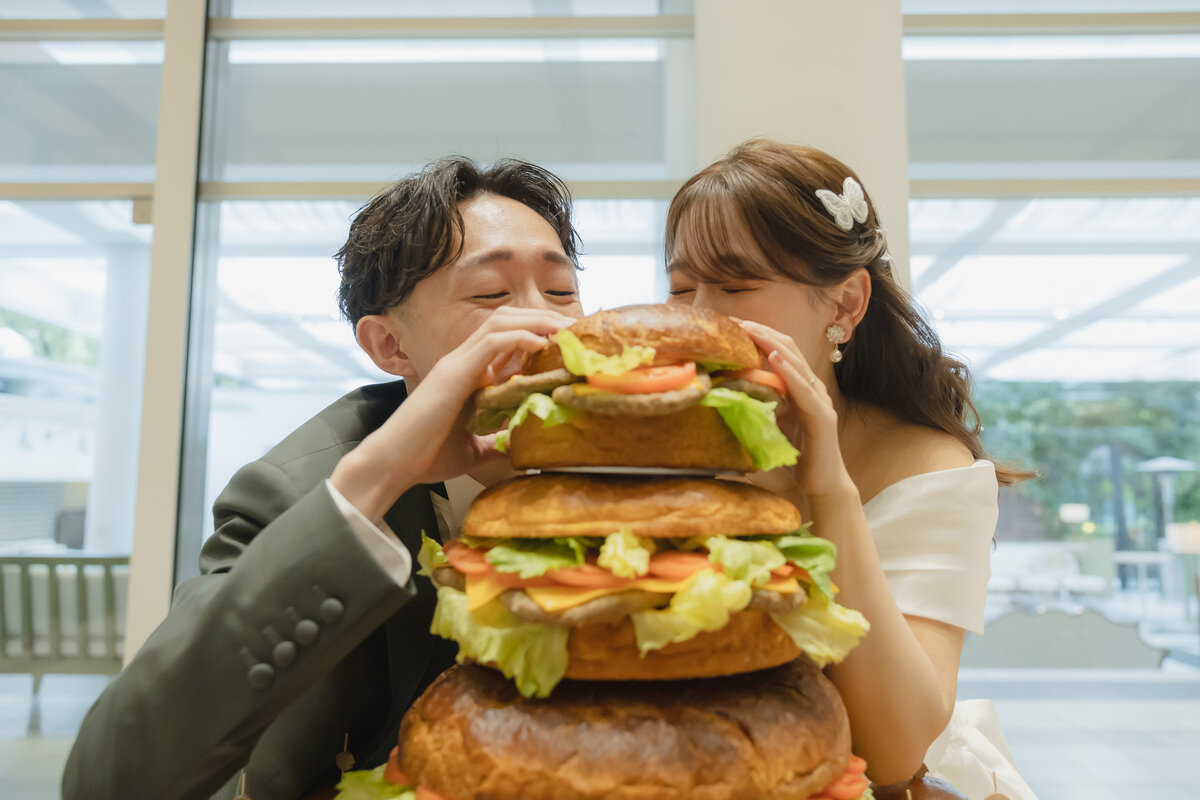 ウェディングケーキのシーンと言えばおふたりがケーキをご入刀するイメージがほとんどだと思うのですが、このおふたりの結婚式はハンバーガーがお好きだからこそウェディングケーキの代わりにハンバーガーが登場しました★