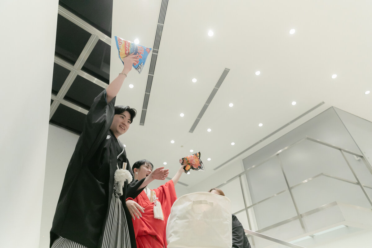 新郎の出身地で、 新郎の小さな頃に正月には餅まきをした思い出から、